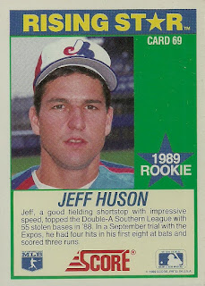 In 12 years with seven teams in the Majors, Huson participated in 827 games and went to the plate for 2127 at-bats, for a batting average of .234. Although the card says he's got good speed, he only stole 64 career bases, with a high of 18 with the Texas Rangers in 1992. Honestly, having been replaced in the Expos' system with Delino DeShields, there was no way history would be kind to him regarding speed; it's akin to comparing me, present-day, 6'2" and over 250 pounds, with The Flash.