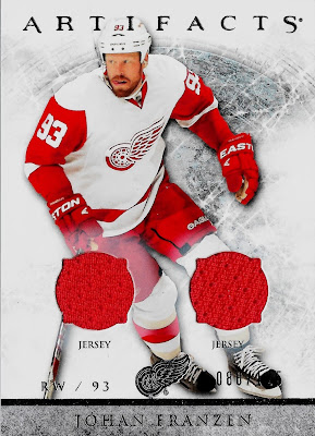 Here he is wearing the Red Wings' white (away) uniform on the dual jersey silver version of card #41 from Upper Deck's 2012-13 Artifacts set, numbered 80/125: